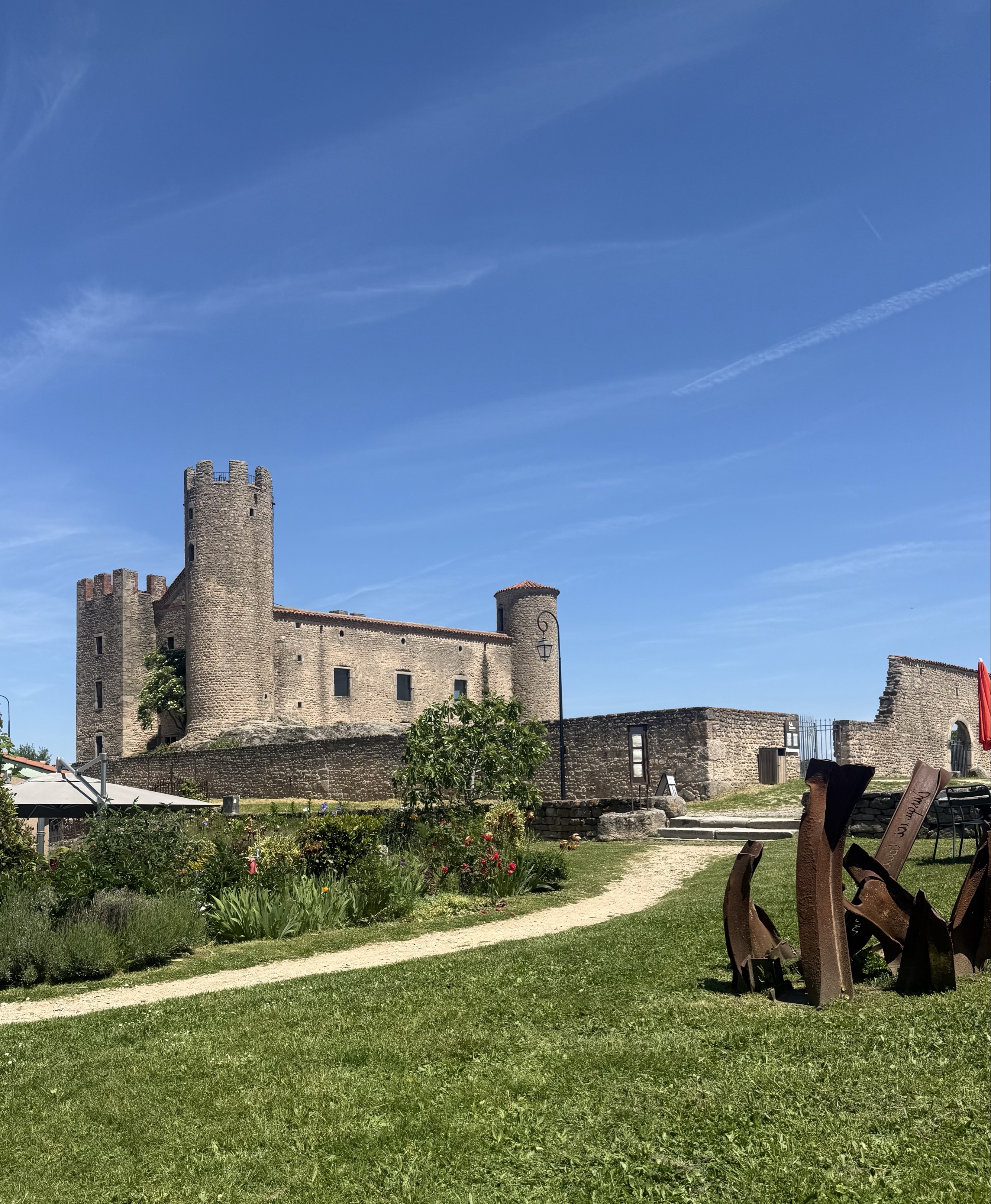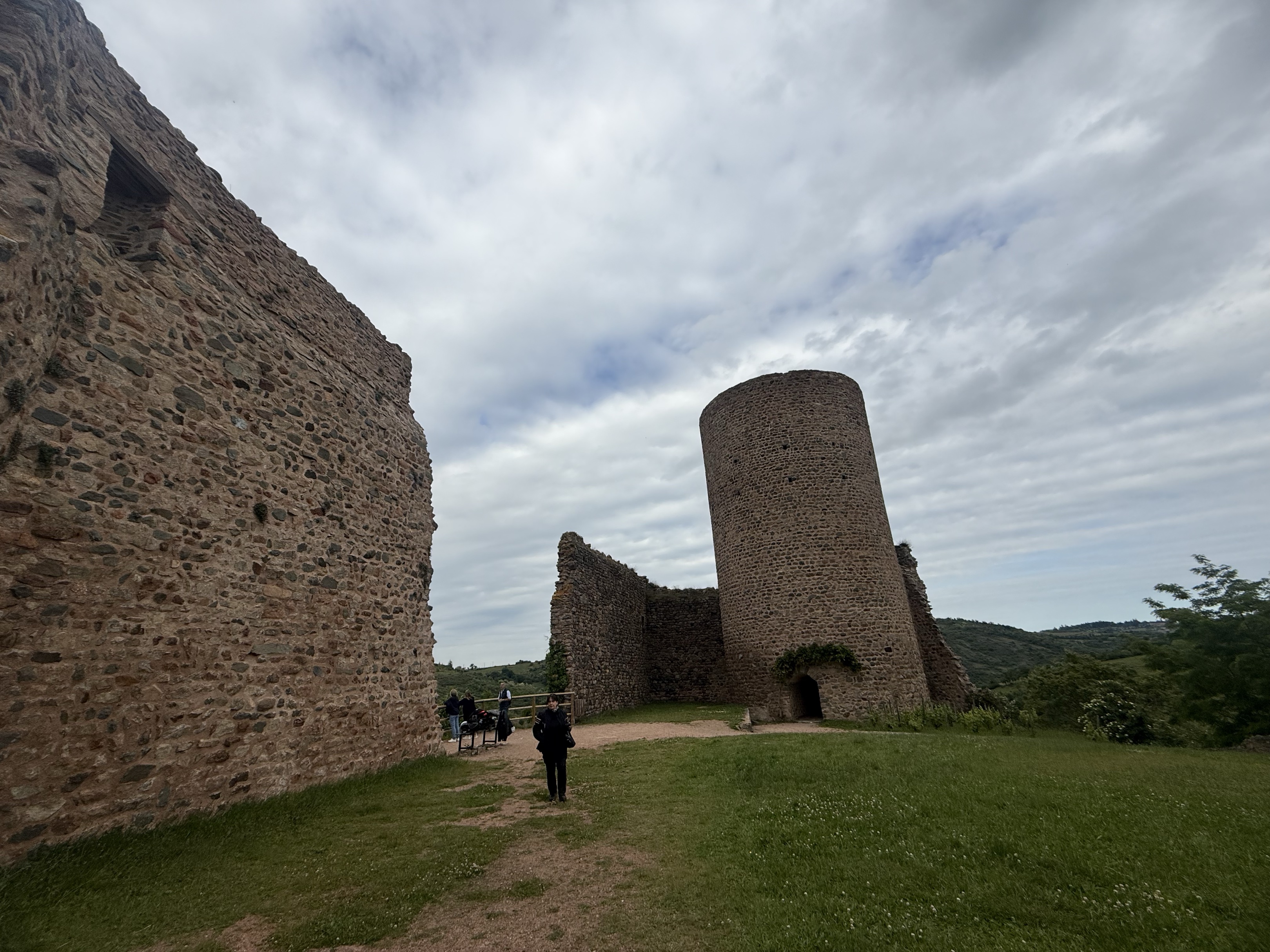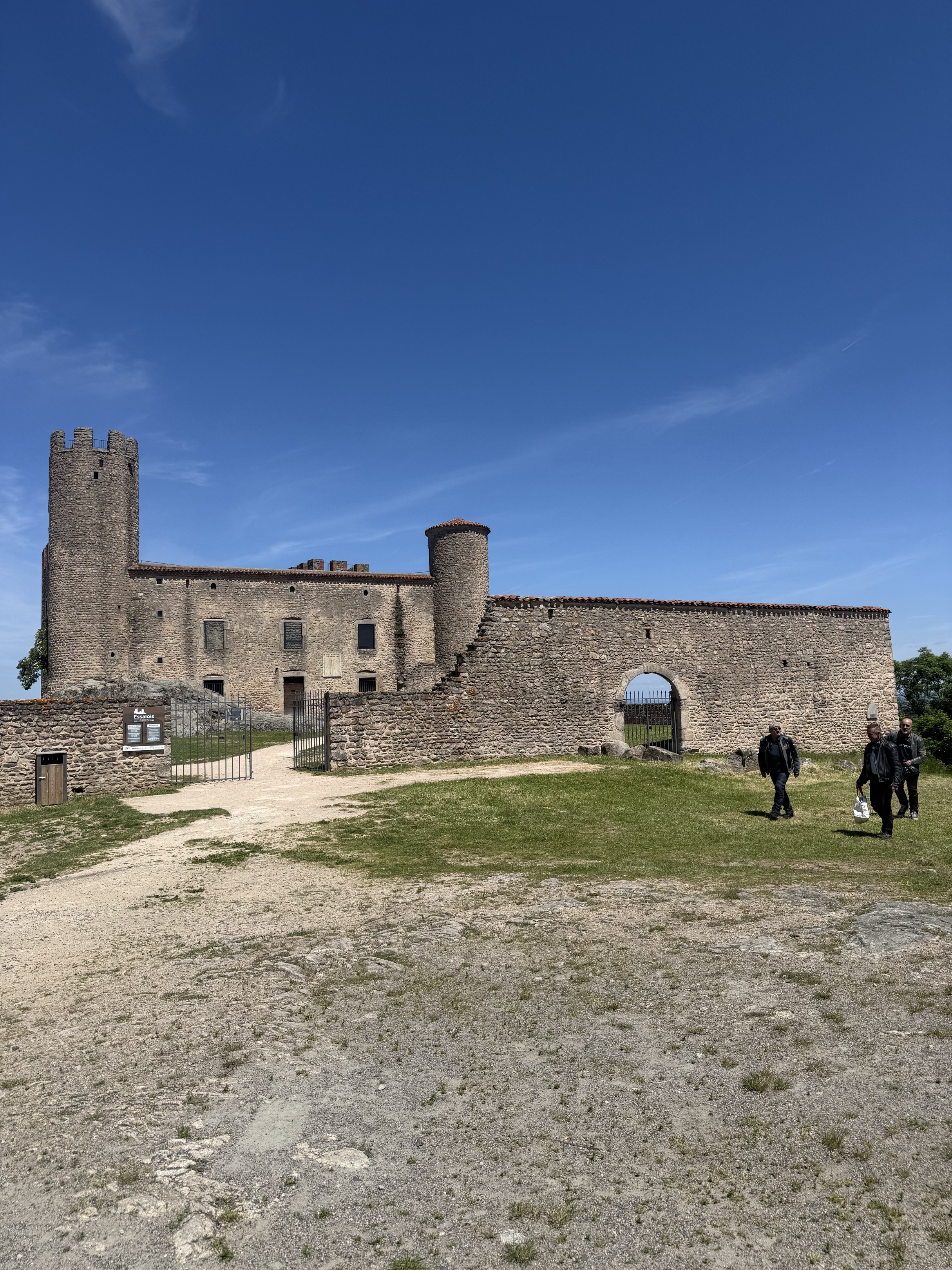 Pique nique au château d’Essalois, derrière les murs. Attention à ne pas faire rouler les casques dans le ravin!