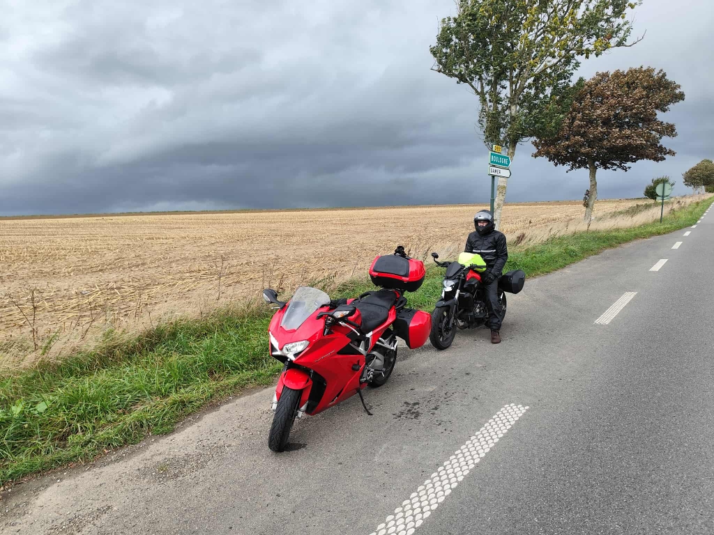 Route fluide, droite et roulante. Nous ne passerons pas par les autoroutes mais départementales françaises et les villages bien sûr. Nous partons sur 4 jours et 3 nuits en hôtel avec parking sécurisé et de quoi attacher les motos. Chambre vue sur les motos à chaque fois.