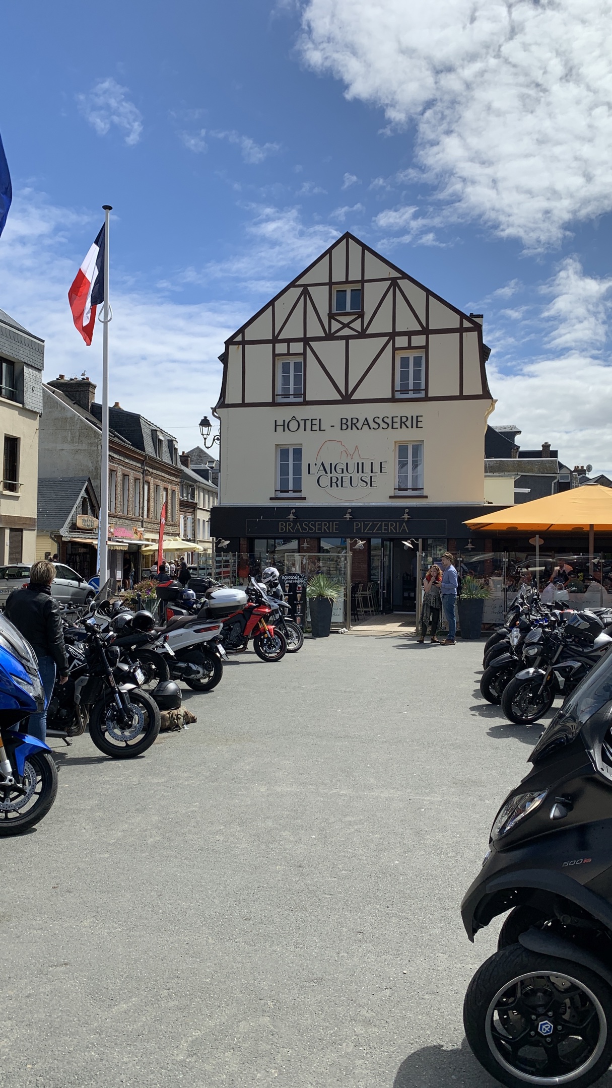 Point positif à Etretat un parking moto vous attend au pied des falaises devant l’hôtel brasserie « l’aiguille creuse »