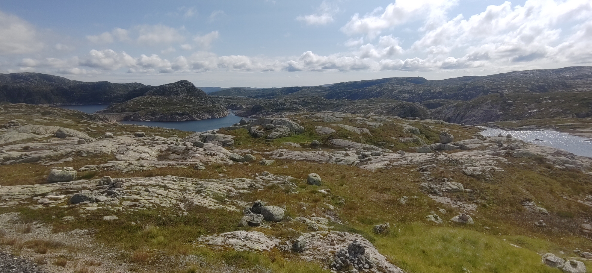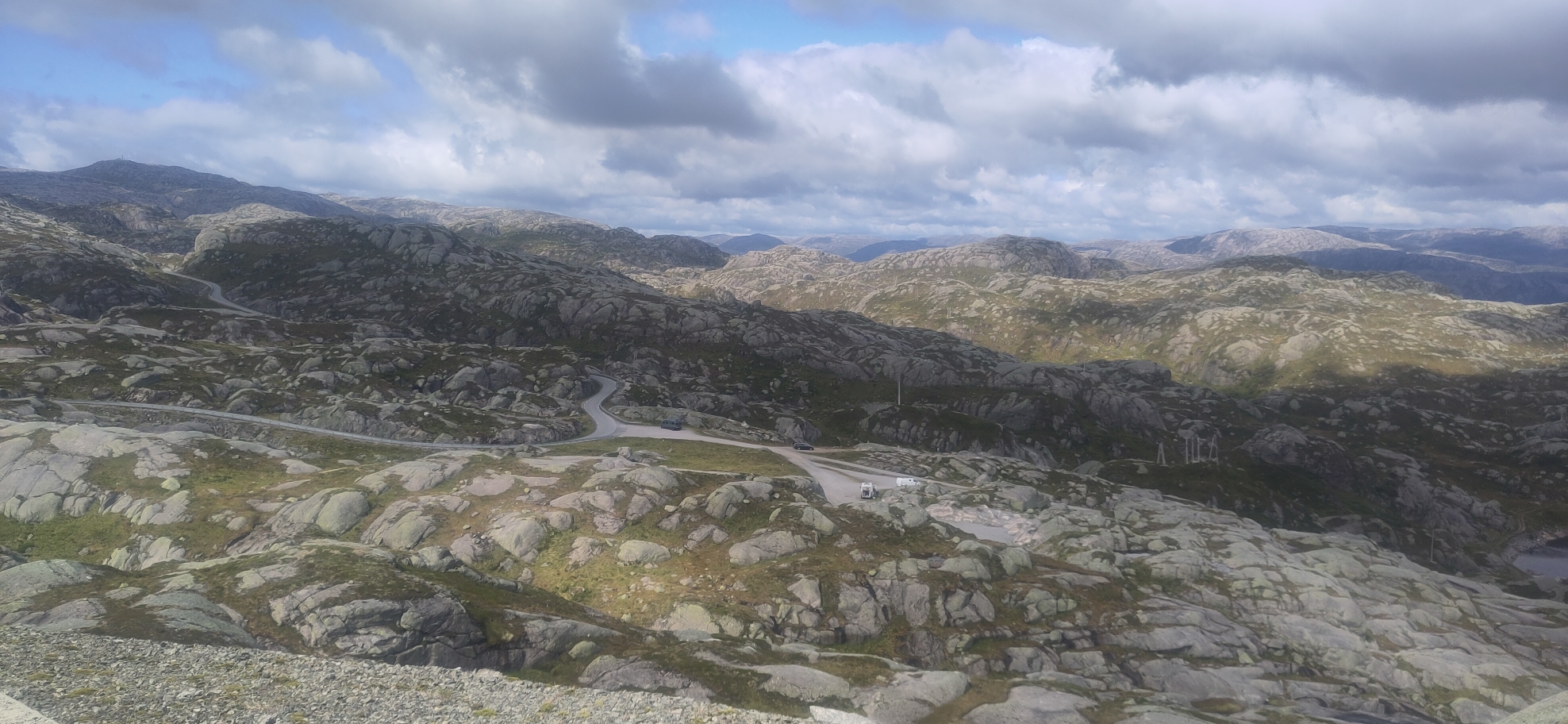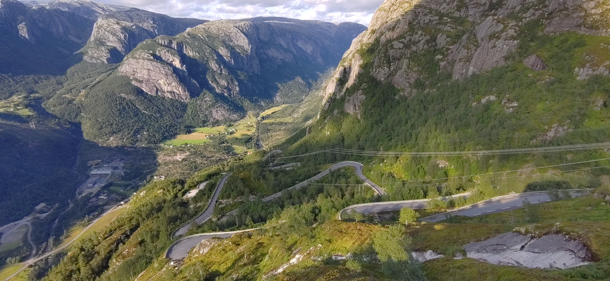 Route extraordinaire dans les montagnes avec la célèbre route en lacets de Lysabotn. Très bonne qualité du revêtement, beaucoup de lacs et neige selon la saison. Extraordinaire point de vue depuis le restaurant du départ du Kjerag, caillou coincé dans une faille à 1000m au dessus du fjord. Point de saut des base jumpers avec une chute de 1000m. Grandioses points de vue sur le fjord et les montagnes.