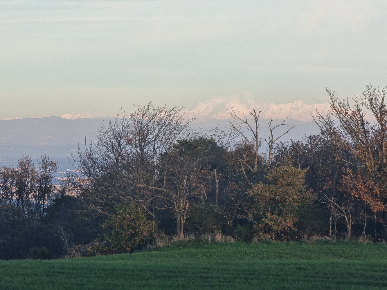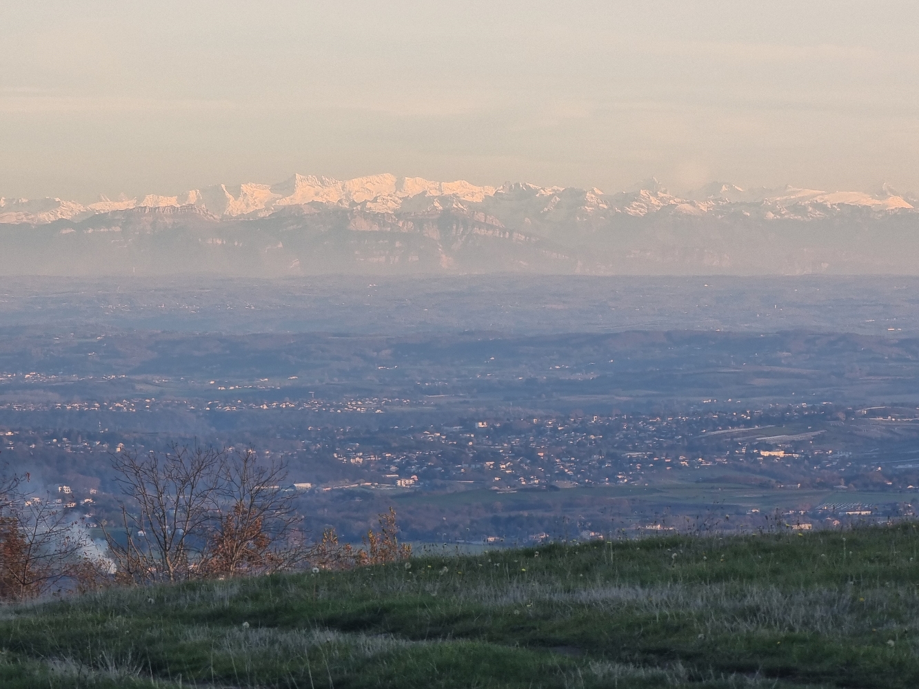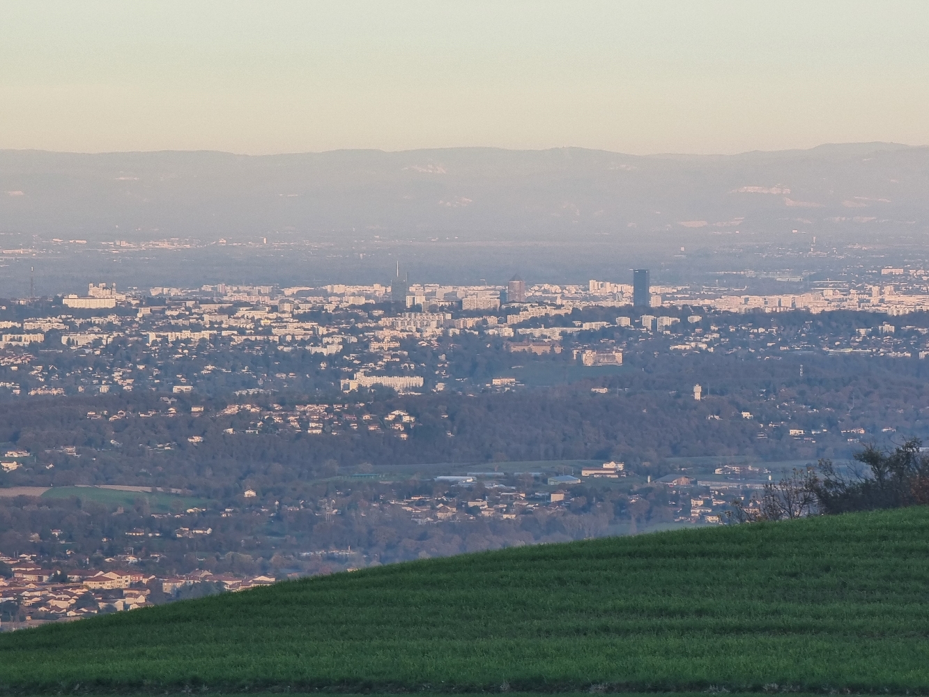 Parti un peu au hasard j'ai découvert des superbes petites routes entre Saint Martin en Haut et Yzeron puis par erreur retour Messimy avec une vue sur Lyon, sur la vallée du Rhône et au fond : le massif du Mont Blanc ! Incroyable 😎