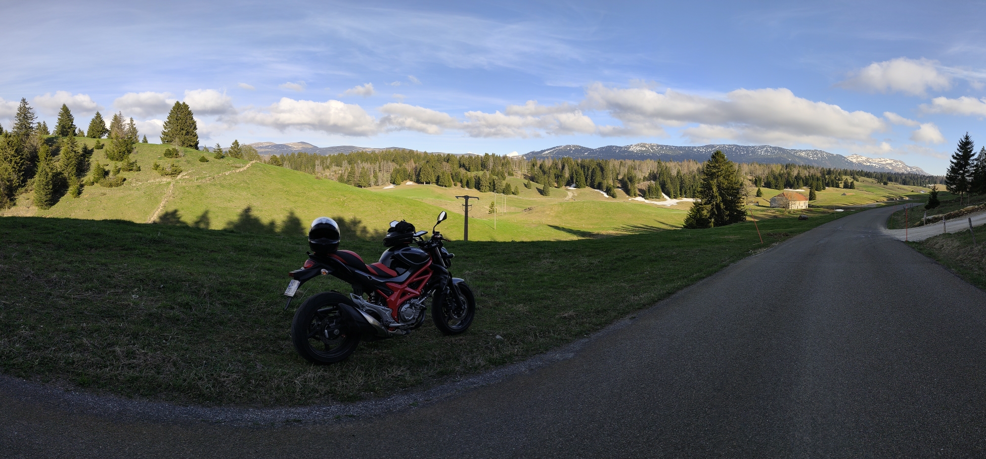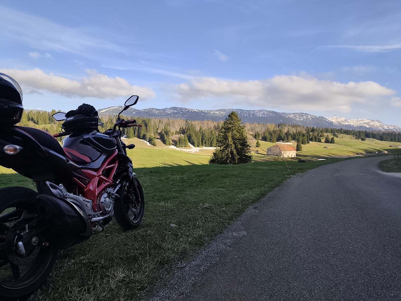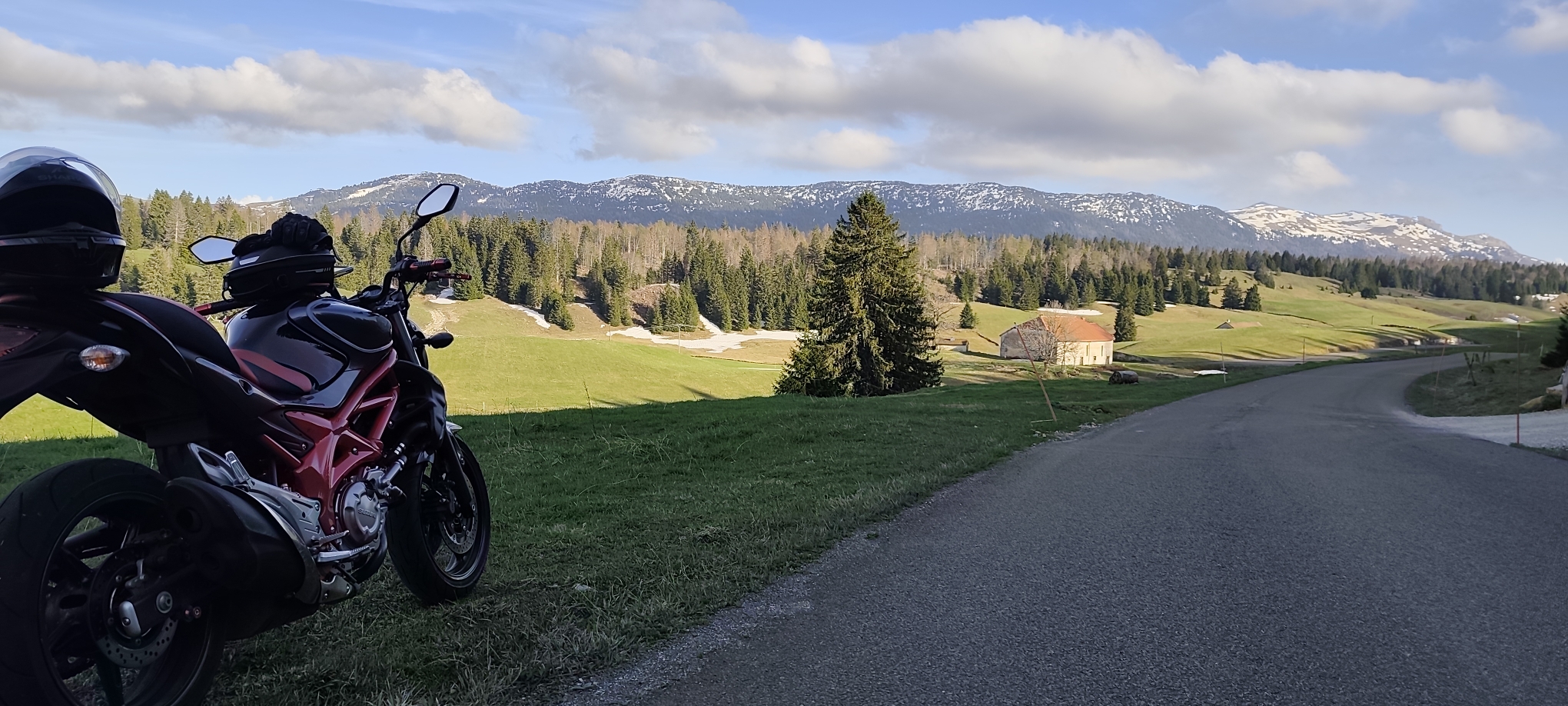 De belles routes sinueuses et de belles lignes droite pour taper dedans au milieu de paysages somptueux. Avant d'arriver au trois cheminée a bellecombe un petit arrêt pour admirer les mint jura encore légèrement enneigé jusqu'à fin avril, c'est magique