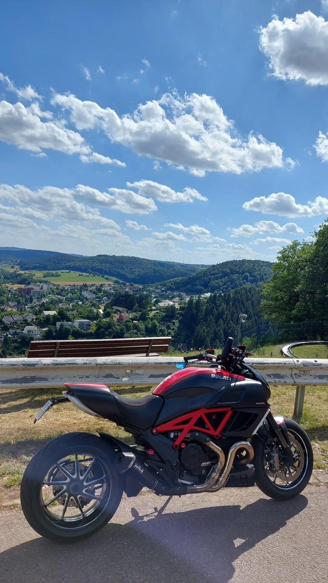 Plein de petites routes, pas toujours au top de la qualité niveau macadam mais de jolis paysages et des virages sympas même avec un rythme cool ! Quant à la ville de Saarburg, je vous conseille une glace sur leur très jolie petite place au centre ville et de monter à moto jusqu'au belvédère, la vue est superbe. Retour aussi par les villages à un rythme sympa pour éliminer la glace ^^