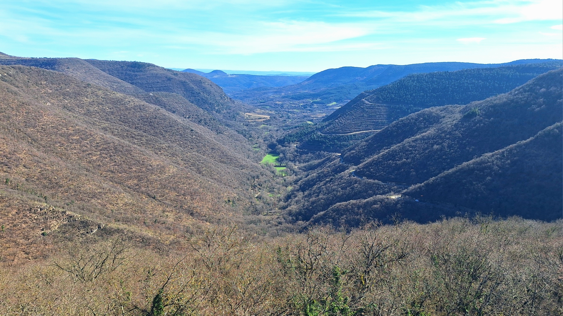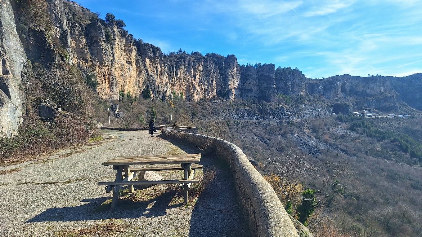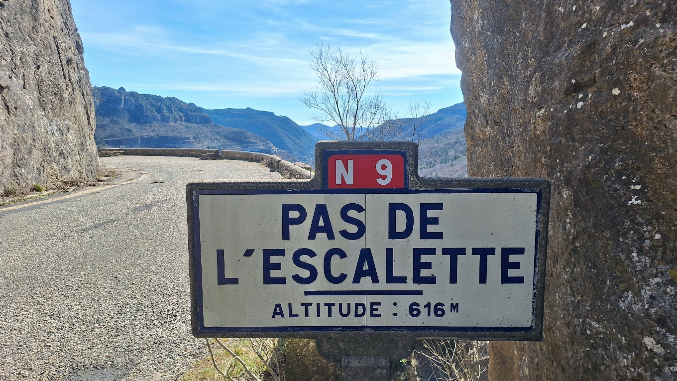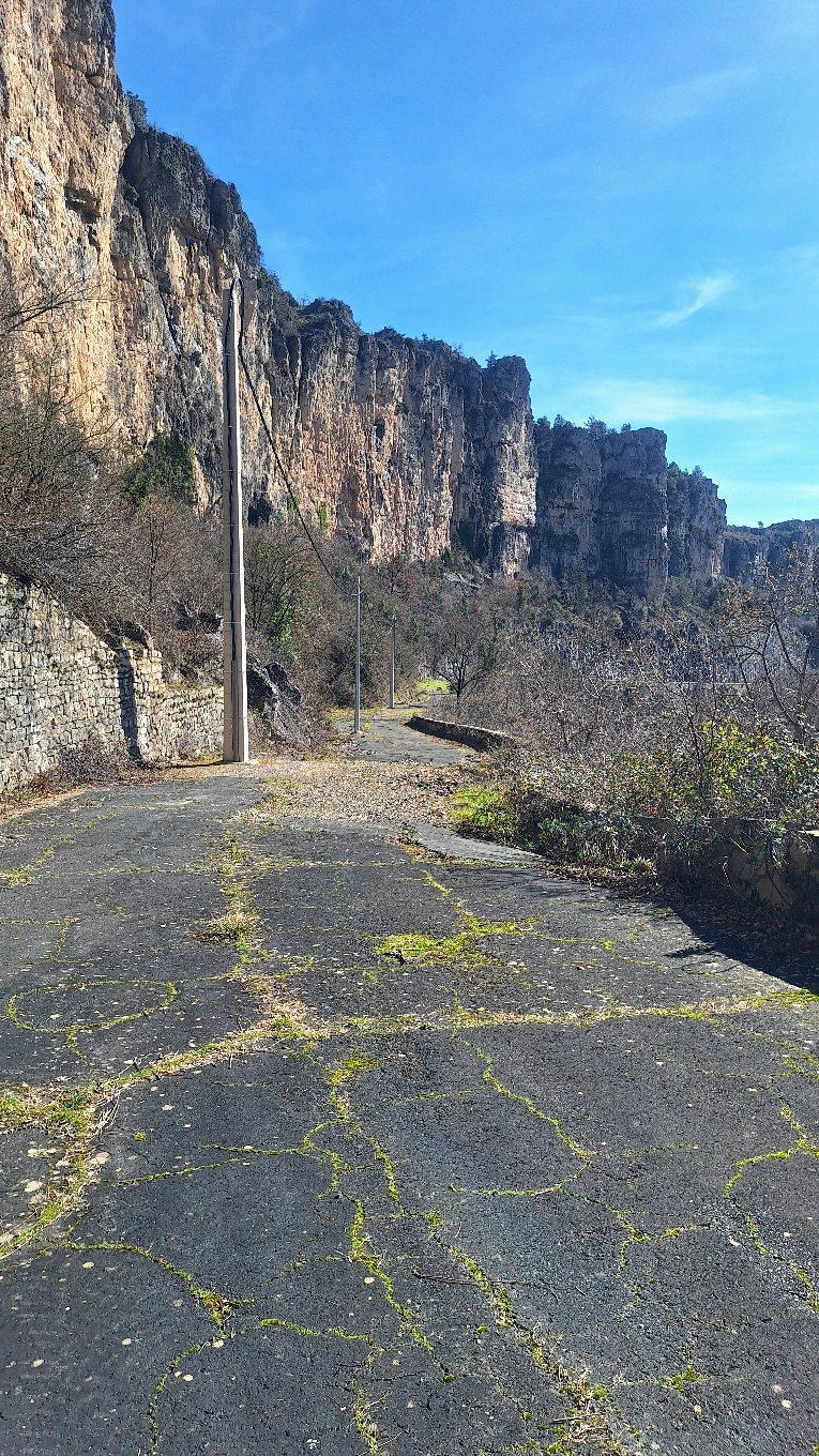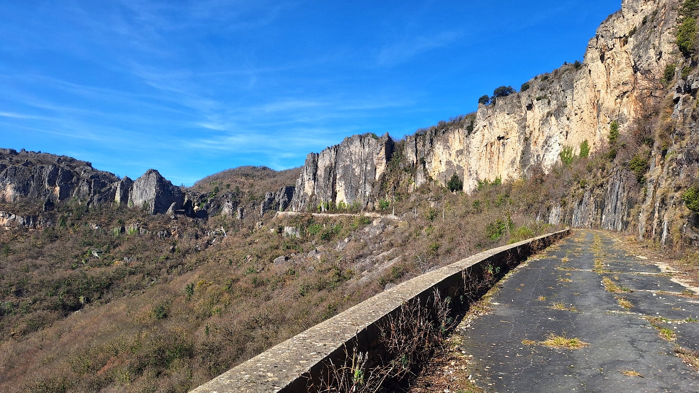 Le panorama sur la vallée du Lodévois et les falaises du Larzac depuis l'ancienne N9 est magnifique. De plus cette portion de route fermée à la circulation depuis 1992 a un petit côté apocalyptique avec son panneau d'antan, son bitume craquelé, la nature qui reprend son droit...