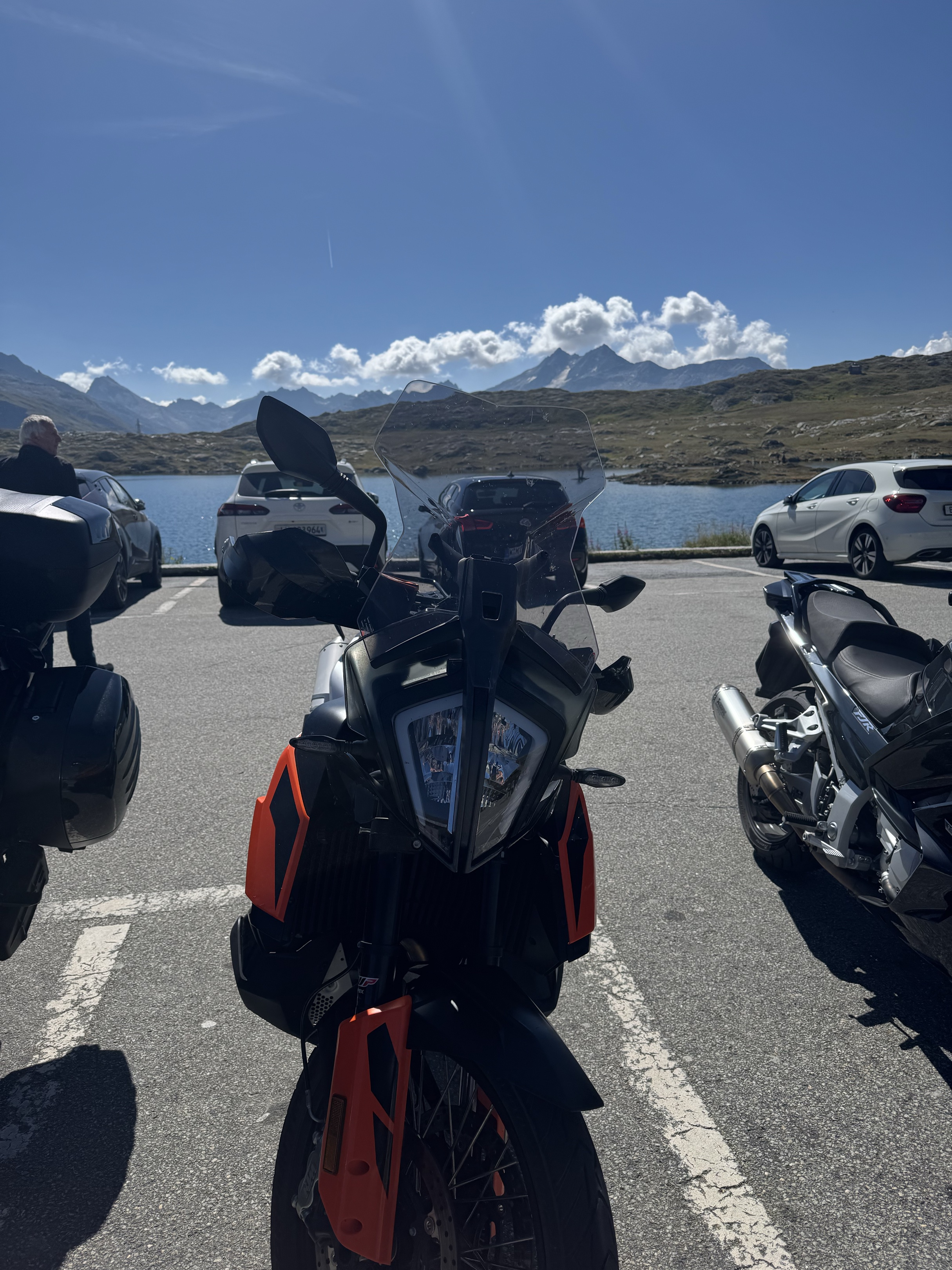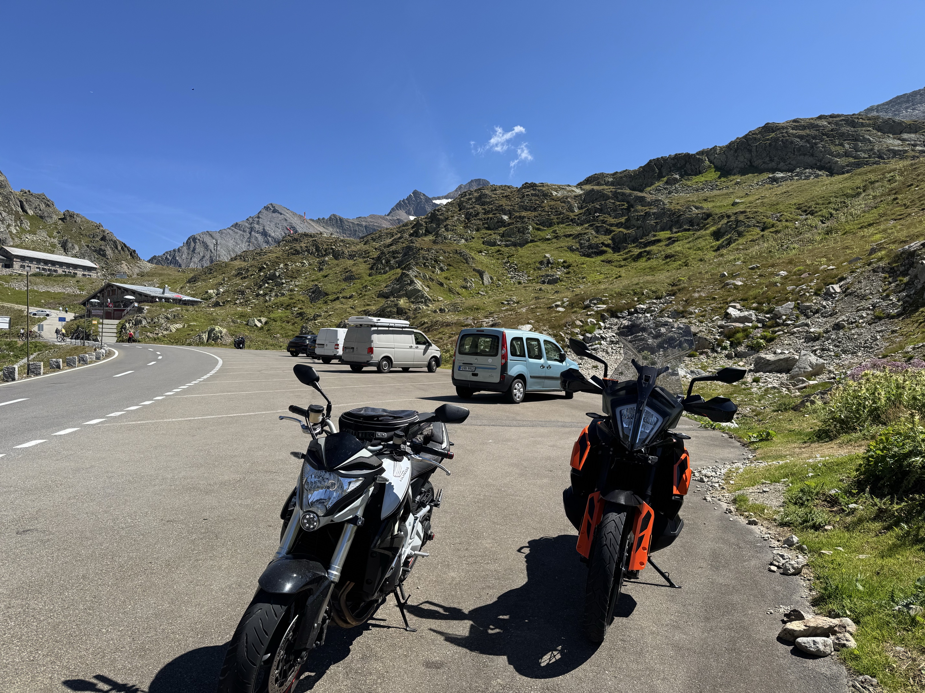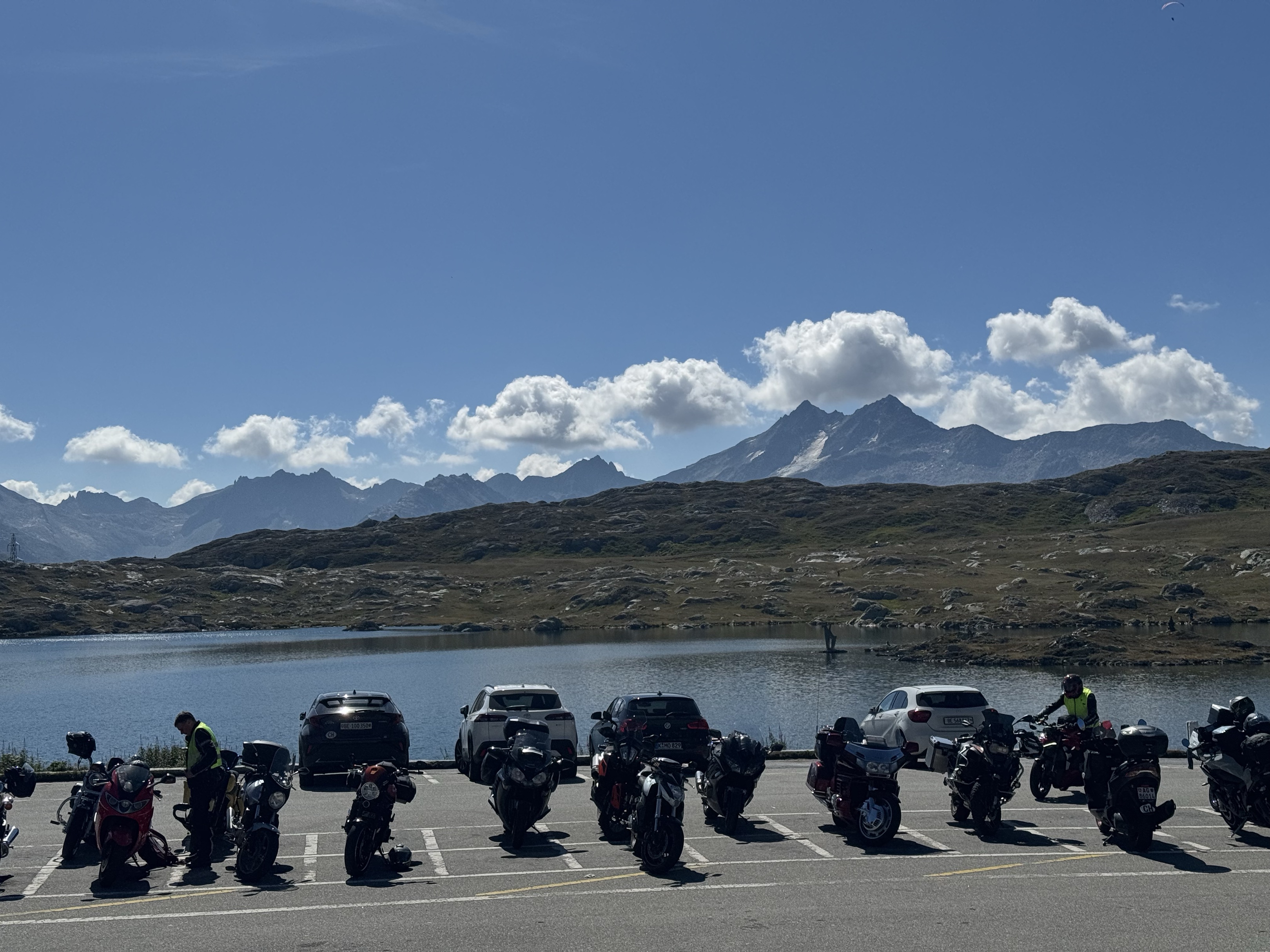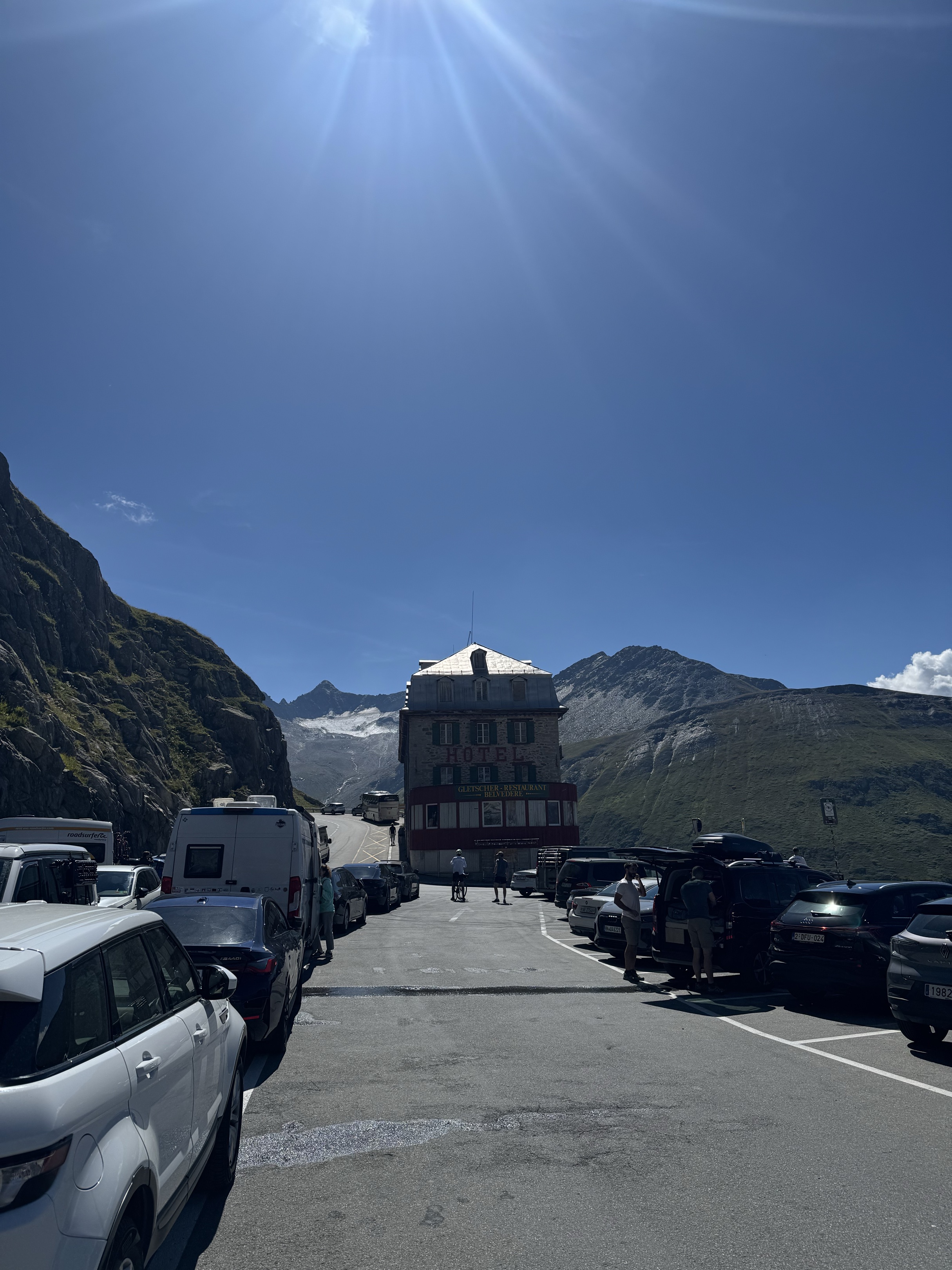 TrĂšs peu de monde, parfait pour se mettre en jambe. Ensuite nous avons traversĂ© de jolies vallĂ©es bernoises, puis longĂ© le lac de Thoune, interlaken puis sortie Ă Hoffstetten bei Brienz pour le deuxiĂšme col du jour: Le Grimsel! Magnifique vue depuis le sommet oĂč nous avons pris un cafĂ©.