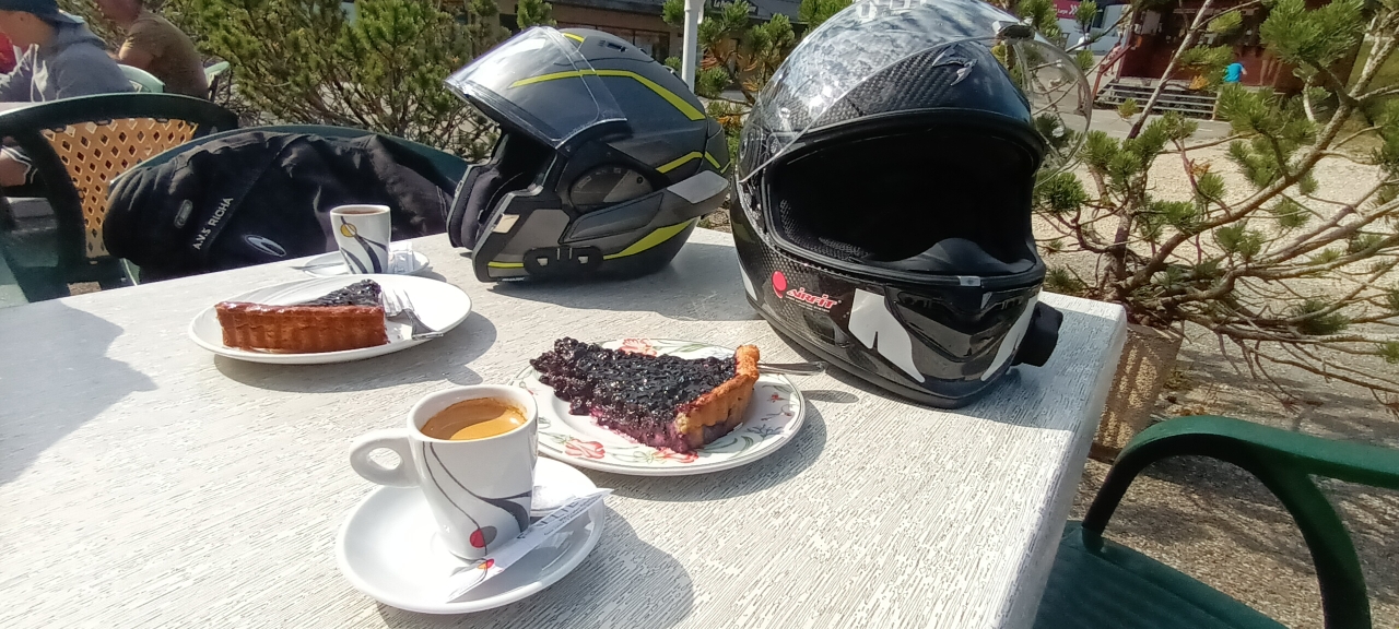 Café + tarte à la myrtille au bar en haut de la Faucille